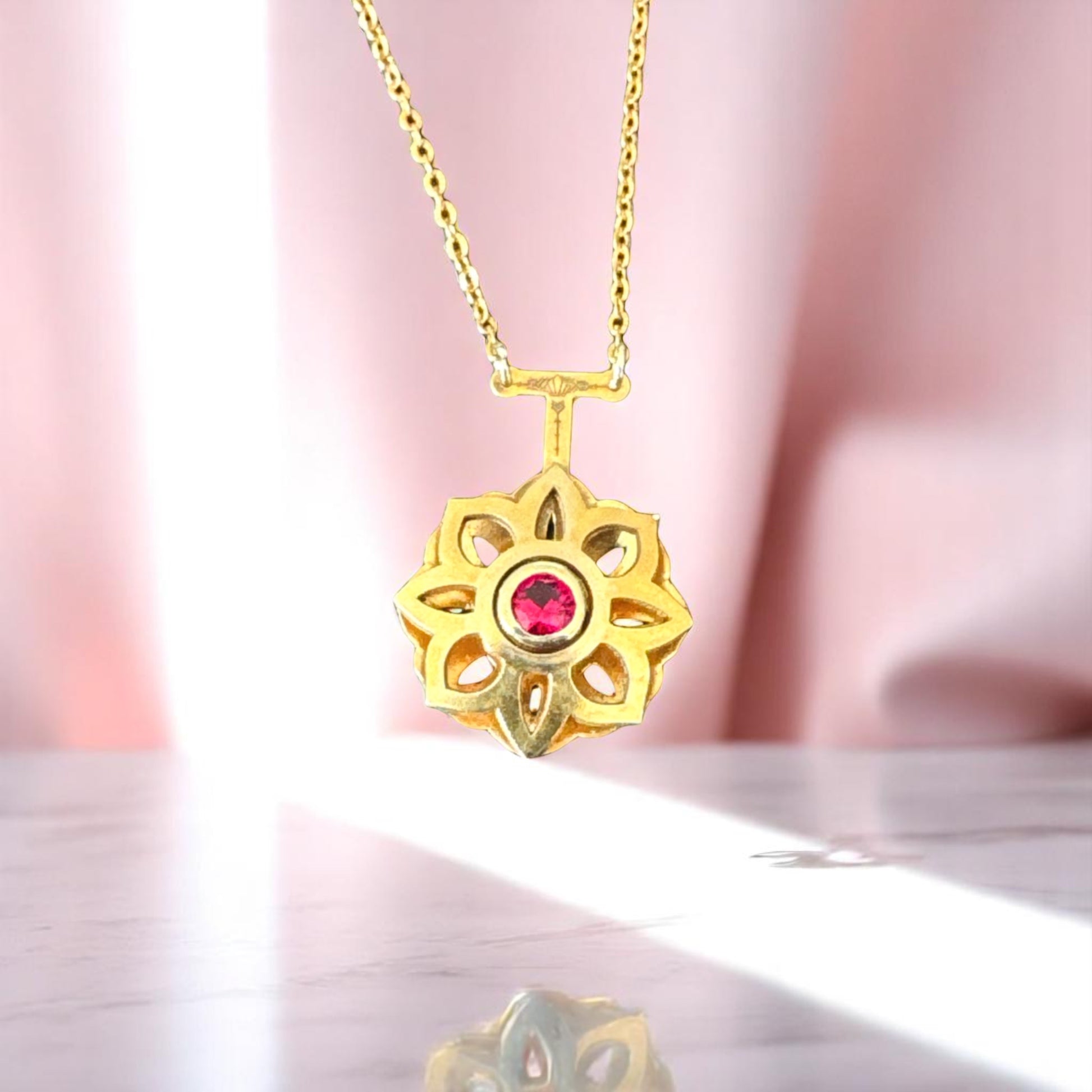 Crafted with laser precision and plated in 24k gold brass, this pendant features stunning gold art deco floral design and a beautiful lab-created ruby. Measuring 7/8" x 1.25", it is a true masterpiece that comes with a 16" gold faceted stainless steel chain. Experience the passion and beauty of this unique necklace and add it to your collection today!