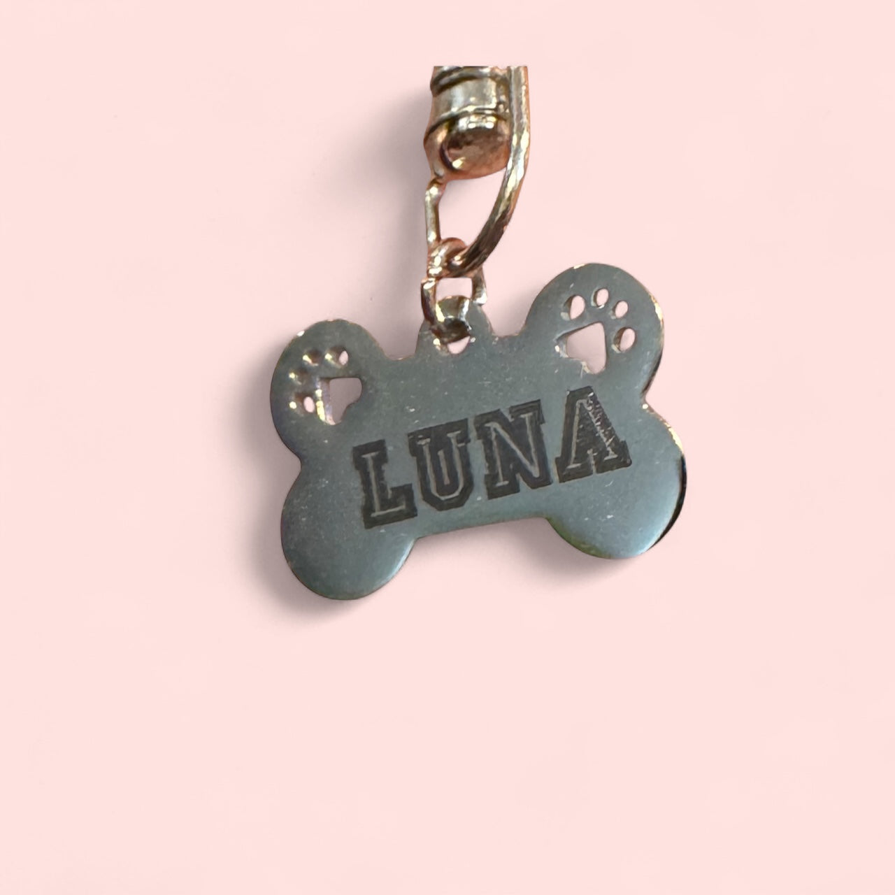 Unleash your pet's unique style with our personalized and engravable silver dog bone name tag. Crafted from highly-polished stainless steel with adorable cut-out paw designs, this tag is perfect for collars or even as a pendant for humans! Measuring 25 x 15 mm, it can also be paired with a keyring or silver chain for added versatility. Make a statement with this one-of-a-kind accessory for your furry friend.
