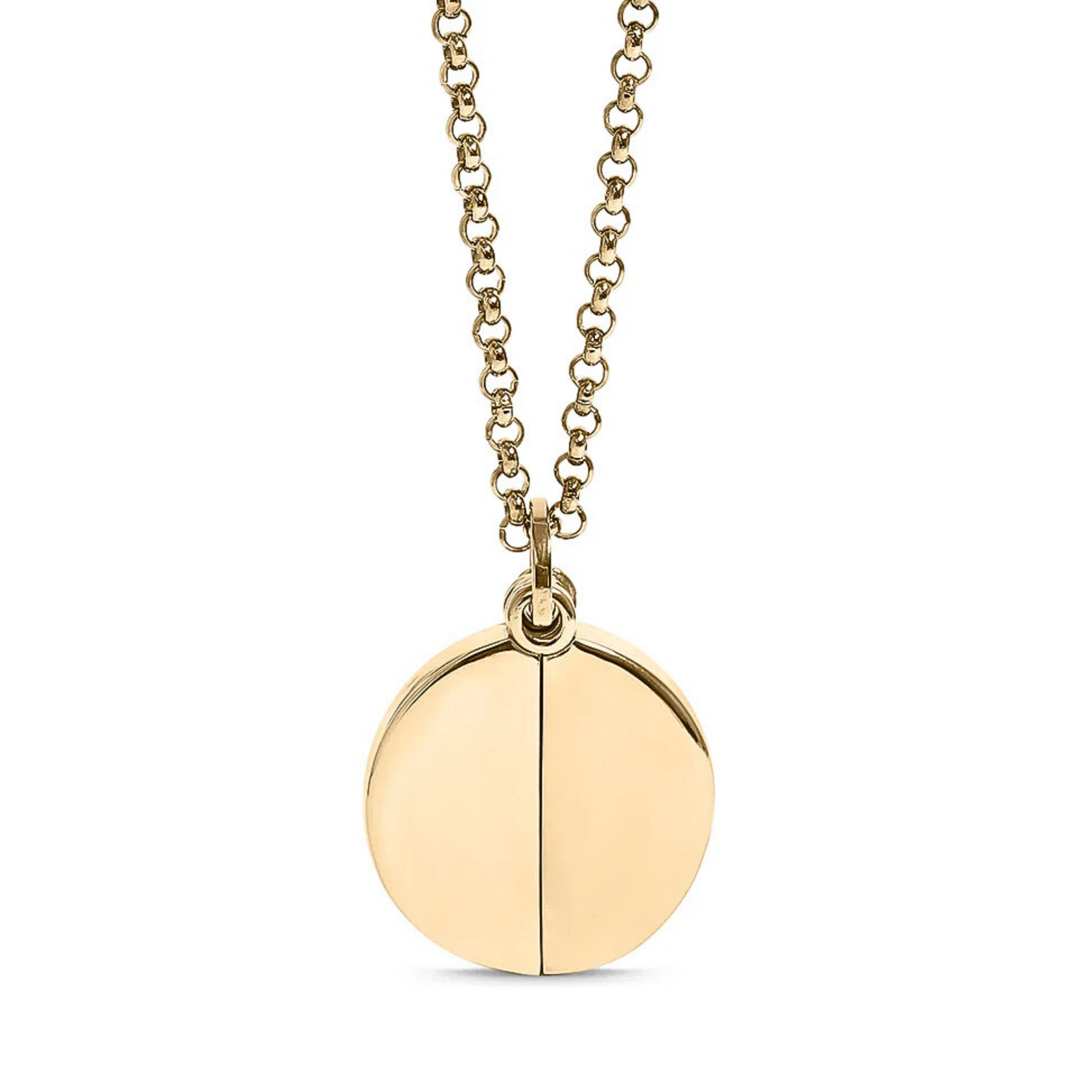Discover the power of personalized messaging with our hidden message medallion necklace. This round pendant is an elegant combination of polished gold or silver stainless steel that is hypoallergenic and resistant to tarnishing. Adorned with a 16" rolo chain and a 2" extension, this necklace is a perfect way to share a special message with your loved ones.